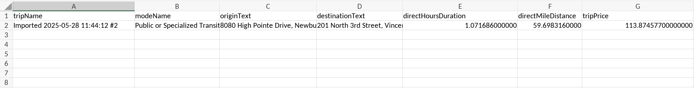 | Example Trip Name | Public or Specialized Transit | 8080 High Pointe Drive, Newburgh, Indiana 47630, United States | 201 North 3rd Street, Vincennes, Indiana 47591, United States |
