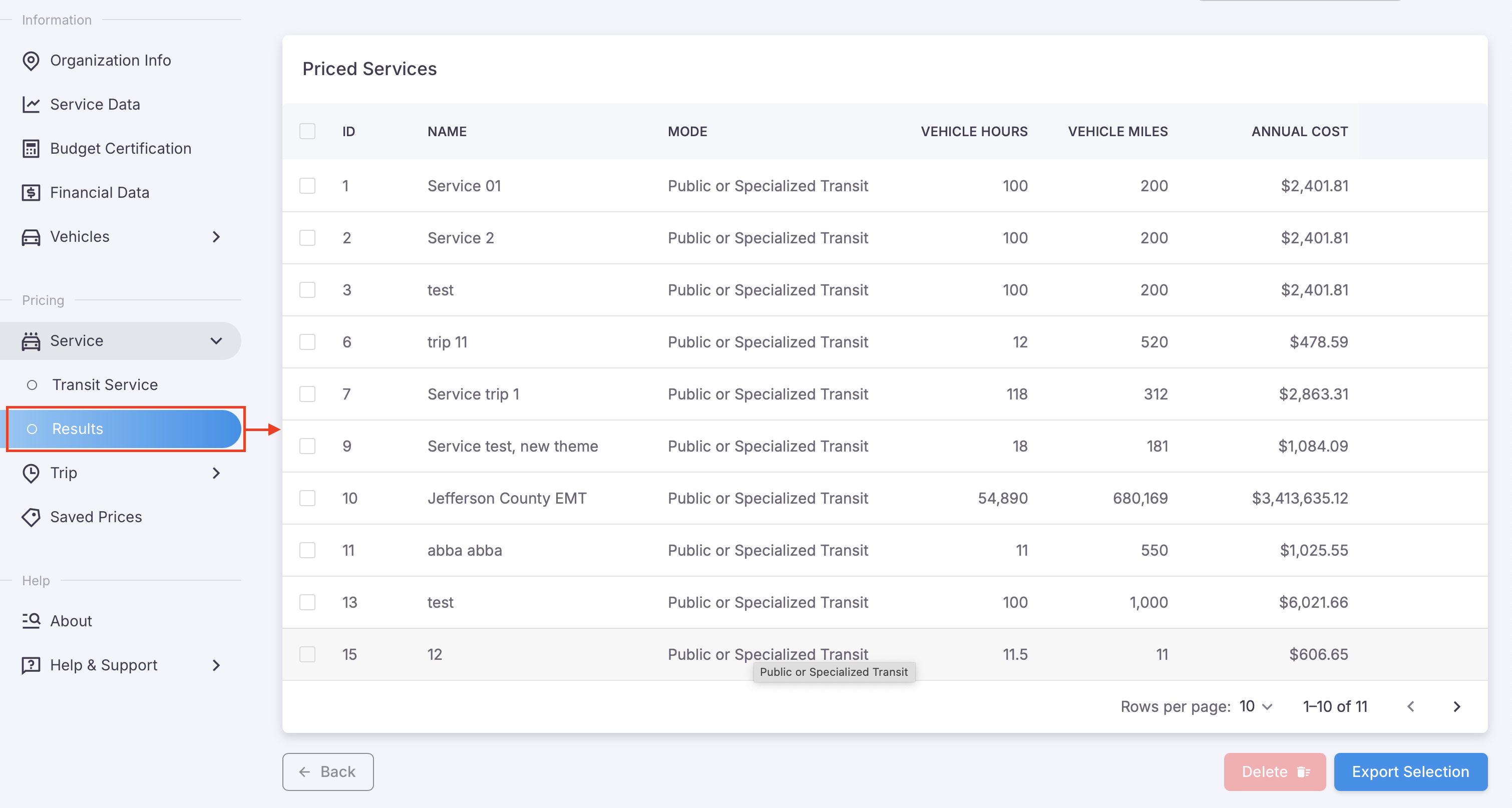 For more information on reporting for Services, please view 'Previously run trips - Navigation Menu, Trip > Results'.