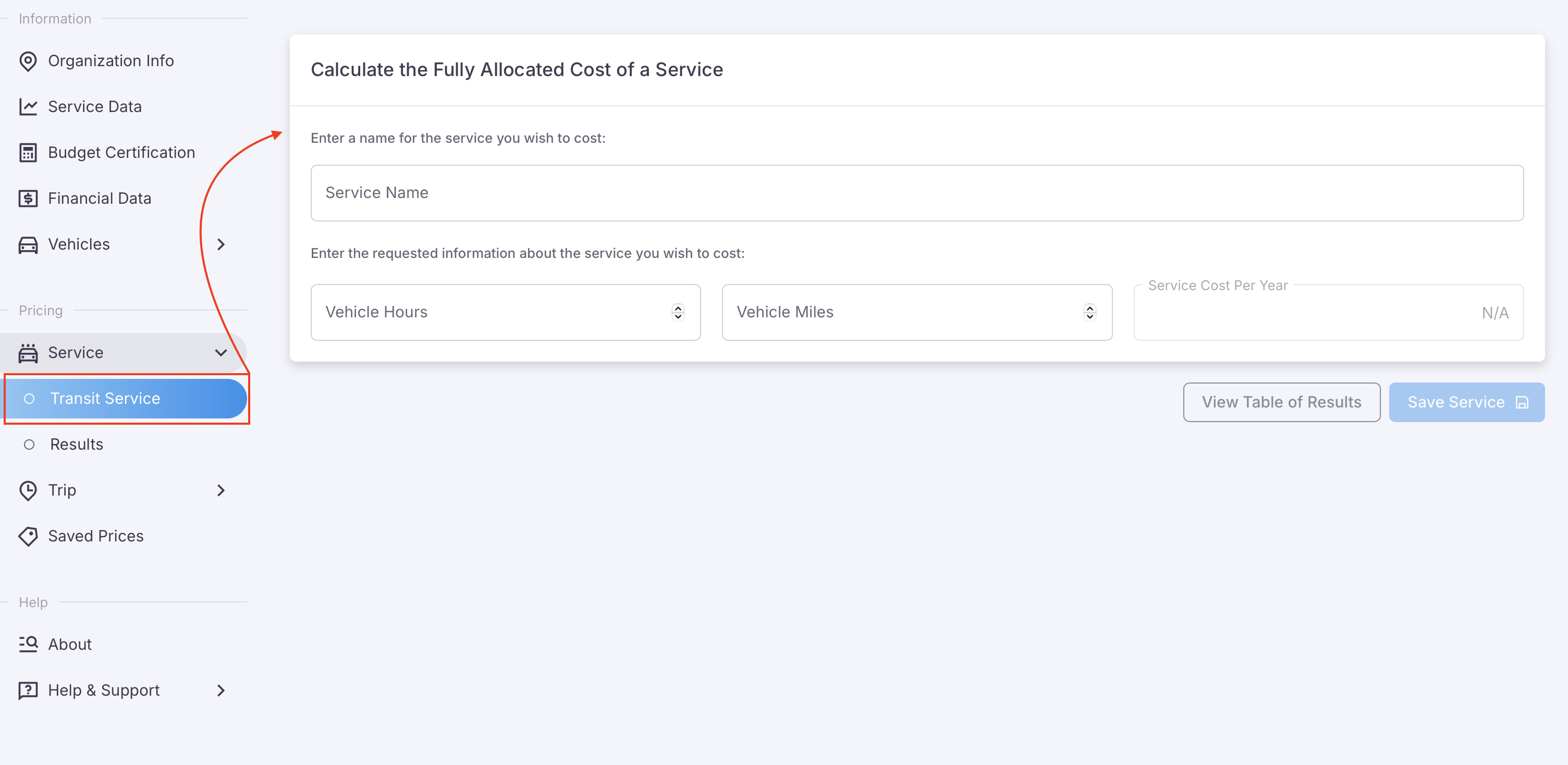 Click 'Save Service' to save this record to the database which can be viewed at any time by clicking the button, 'View Table of Results'. Alternatively, you can access previous saved records through the navigation menu as shown in the image below.
