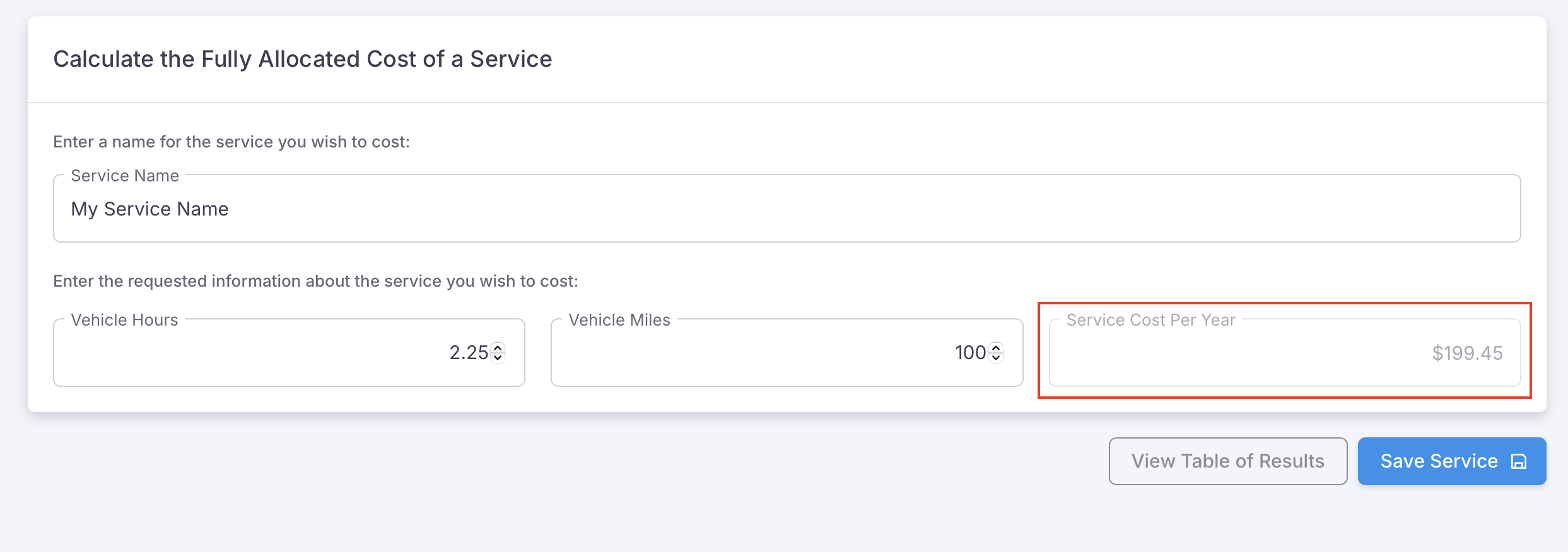 As shown in the image below, by entering these three data points, the Service Cost Per Year will auto-populate.