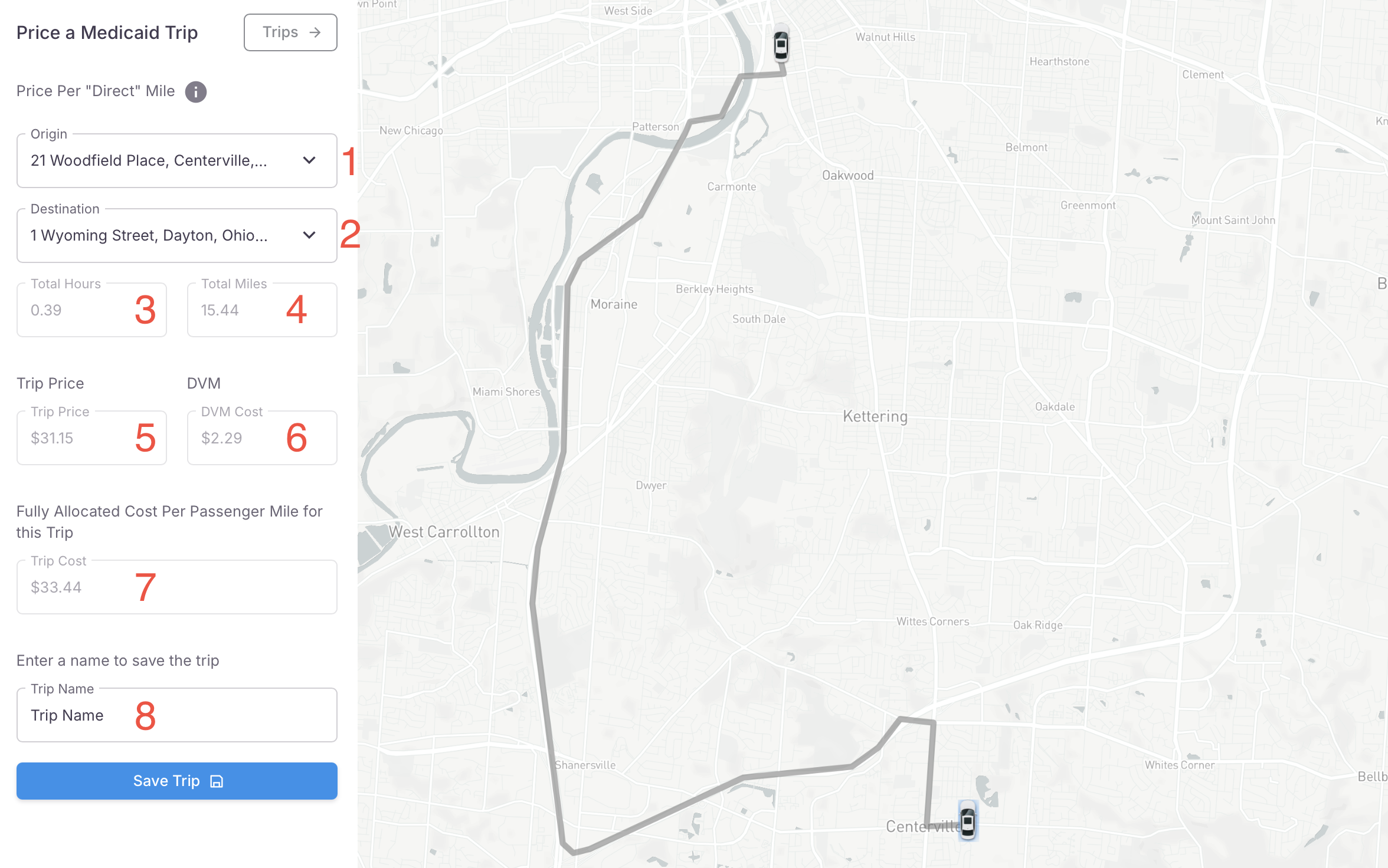- Click the 'Trips' button located in the top right of the input form