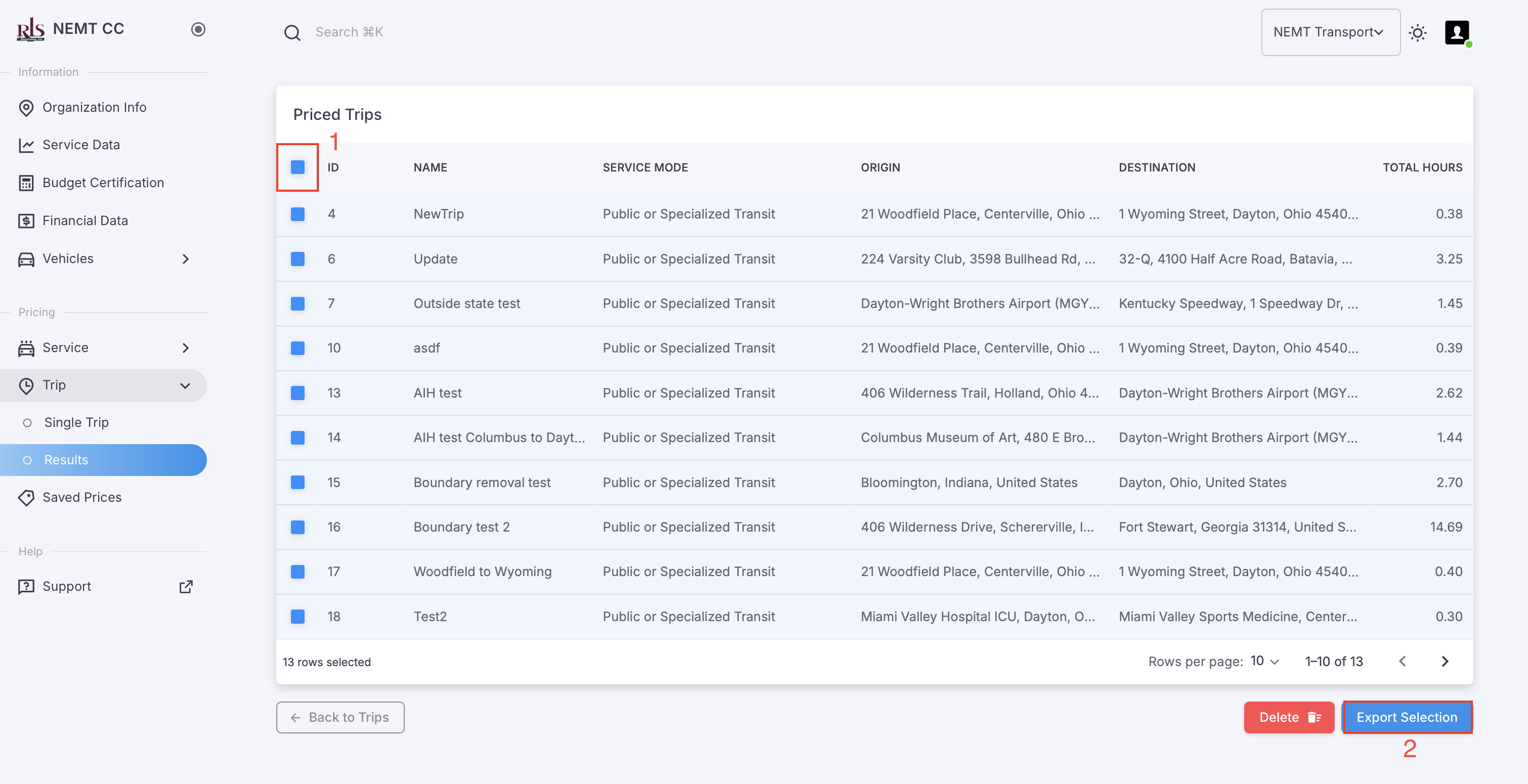 All previously recorded trips and individually selected trips are able to be exported from the NEMT CC application. To export data, please follow these simple steps;