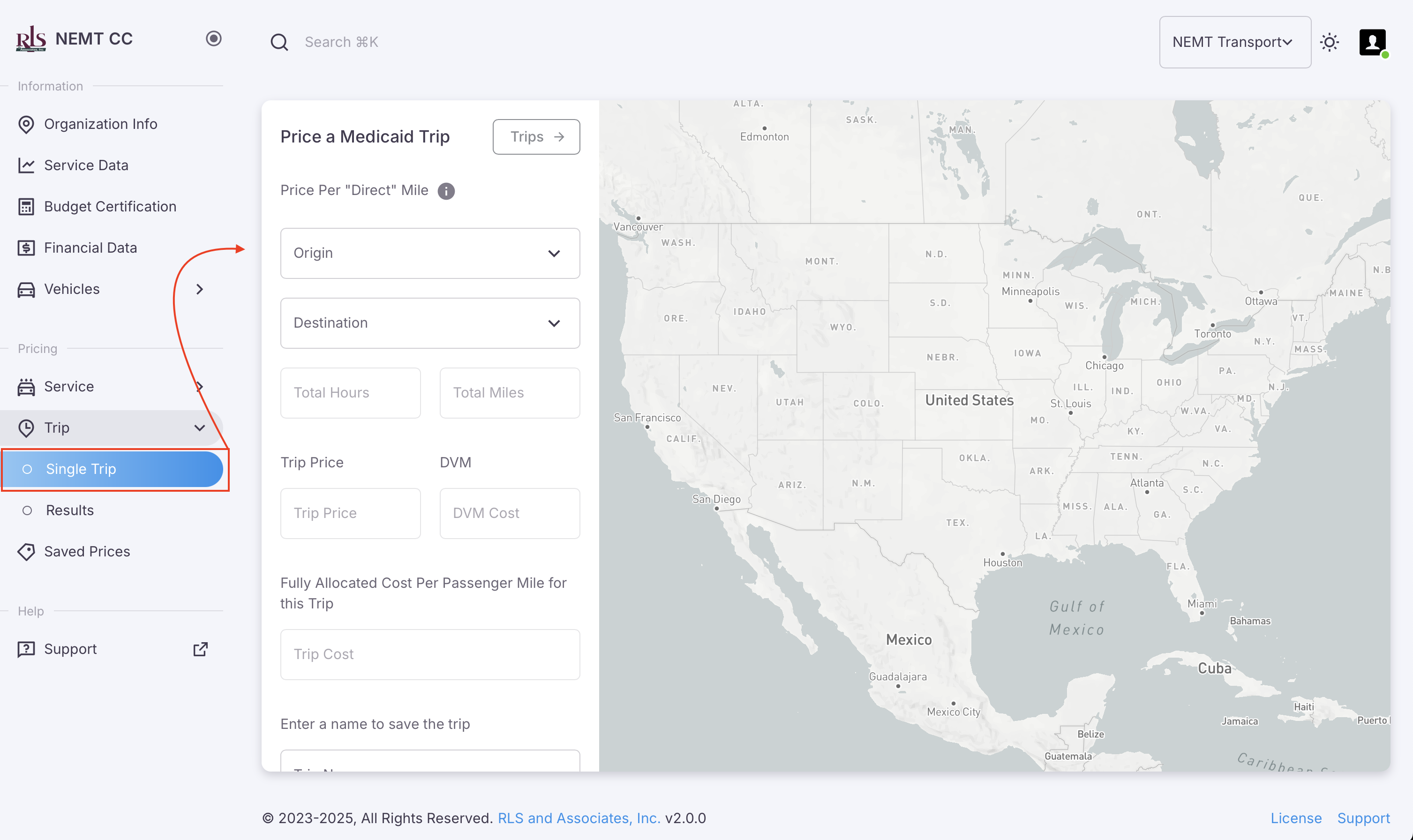 To access Trip Pricing, select Single Trip in the navigation menu as shown in the image below.